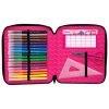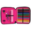 2 zipa; sadrži 48 komada pribora: flomaster školski 18 boja, boje drvene 18 boja, olovka grafitna HB x 2 komada, šiljilo, gumica, ravnalo pvc, olovka kemijska trobojna, olovka tehnička 0,5 mm, mine 0,5 mm, olovka kemijska, trokut pvc, škare školske i raspored sati obostrani; dimenzija: 23x20x5 cm