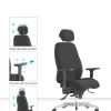 Naslon: Visoki podstavljeni naslon, podesiv po visini, Podizanje: Klasa 4 prema BIFMA standardu, Sjedalo: Pjena visoke gustoće, podesivo po dubini i kutu nagiba, Naslon za glavu: Podesiv po visini, Naslon za ruke: Ručke podesive po visini s PU ručkama, Višenamjenski mehanizam: Funkcija ljuljanja. Visina korisnika: 160 do 200 cm; Nosivost: 180 kg Jamstvo 2 godine